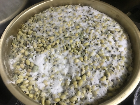 私が分けてもらった豆は青大豆で、ずっと昔から作ってきた品種ということ。皮は薄い緑色で、芽のところが黒っぽいので、白味噌にしたら黒いぽつぽつが目立つだろうけど、気にしない。かなりおいしいはずだからだ。本来煮豆にして食べた方がいいのだが、その方がそれしかつくってないのでそれを使わせてもらう。