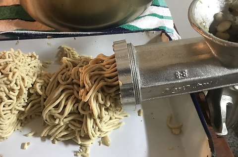 ミンサーで煮た豆をミンチする。なんかモンブランっぽい。